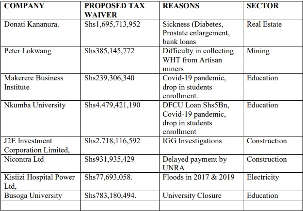 Henry Musasizi, the Minister of State for Finance, named the beneficiaries of the proposed tax waivers: Nkumba University, J2E Investment Corporation Limited, Nicontra Ltd, Kisiizi Hospital Power Ltd, Busoga University, Makerere Business Institute, Peter Lokwang, and businessman Donati Kananura.