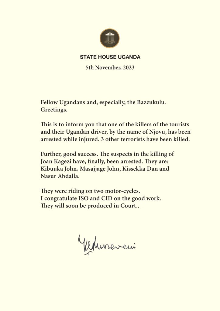 “I inform you that Njovu, one of the assailants responsible for the deaths of the tourists and their Ugandan driver, has been arrested while injured. Three other terrorists from the same group have been killed, perpetrators of the heinous acts including the murder of Lhubiriha children and other incidents,” stated President Museveni.