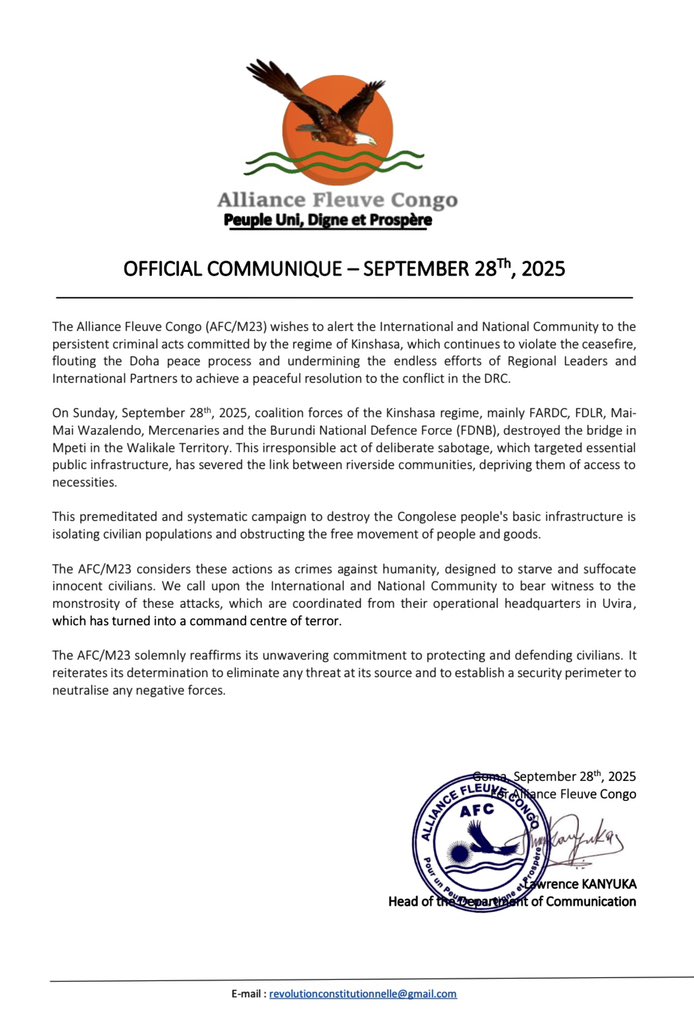 The Alliance Fleuve Congo (AFC/M23) has accused government-backed coalition forces of deliberately destroying key public infrastructure in North Kivu, alleging continued violations of ceasefire agreements.